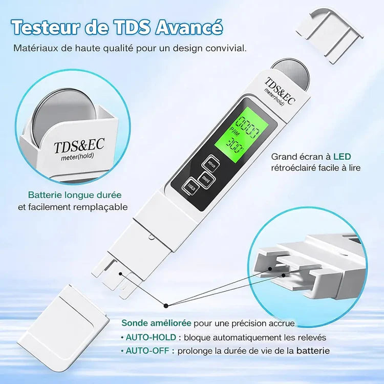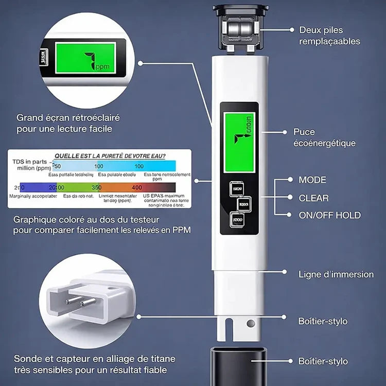 Un testeur numérique de précision qui mesure instantanément la qualité de votre eau — robinet, filtrée, bouteille — pour protéger la santé de toute votre famille.